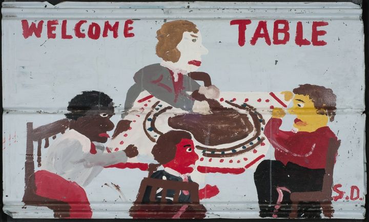 Welcome Table (ca. 1970-1980) // House paint on roofing tin